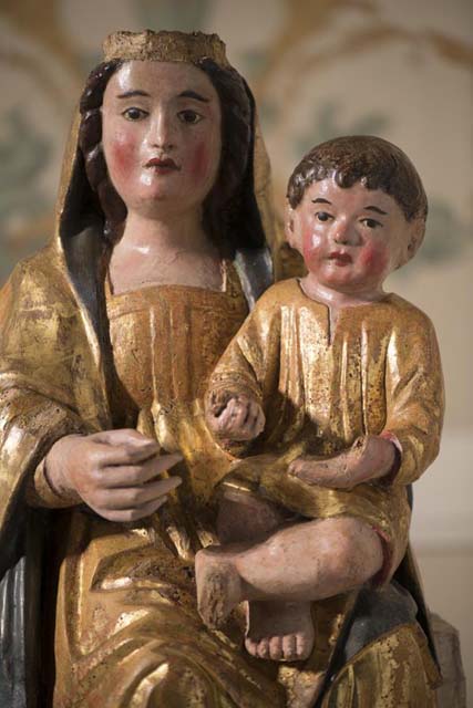 La Madonna, seduta su un seggio, tiene sulle ginocchia Gesù Bambino con le gambe incrociate. Maria indossa una veste dorata con scollo quadrato e un mantello anch'esso dorato con l'interno blu, che le copre anche il capo ed è rigidamente panneggiato. La corona originaria è in gran parte perduta. Gesù veste una camiciola dorata con scollatura rotonda. I volti di entrambe le figure sono pieni, caratterizzati da gote rosse e bocca cuoriforme e incorniciati da capelli scuri.
