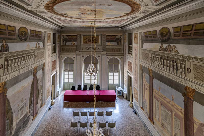 Il salone viene ricordato abbellito con affreschi di Giulio Quaglio, poi coperti dalla nuova decorazione ad opera di Domenico Paghini durante la proprietà Garzolini, da inizio Ottocento a inizio Novecento. Infatti nel 1790 il palazzo venne comprato da Giuseppe Garzolini e da Margherita Mangilli. Su una parete, in una scena mitologica è presente la sigla “D. P. F.”, sciolta come “Domenico Paghini Fecit” e quindi riconosciuta da parte della critica come firma di Domenico Paghini (Bartolini, Bergamini, Sereni 1983, p. 235; Visentin 2017, p. 145). Inoltre la pitture vengono citate come “muri e soffitti dipinti con architetture e figure” nelle perizie del 1817, anno che diviene quindi termine ante quem per datazione del salone. Erroneamente, forse una disattenzione nel riportare notizie obsolete, la stessa fonte attribuisce a Quaglio le pitture (Bartolini, Bergamini, Sereni 1983, p. 235; Visentin 2017, pp. 143-145, n. 54). Paghini qui mostra il tentativo di amplificare lo spazio in maniera illusionistica raffigurando degli ampi loggiati con sfondamenti architettonici e balconate, che vanno idealmente a continuare il ballatoio reale presente ad una medesima altezza. L’estro inventivo, seguendo alcune reminiscenze di architetture animate da figure dal gusto veronese o tiepolosco, viene però costretto da una formazione accademica, soprattutto nel disegno quasi scolastico della prospettiva e dei singoli elementi. La mediazione sperimentata dall’artista tra stilemi veneziani settecenteschi e il gusto neoclassico non riuscì totalmente andando ad irrigidire le scene raffigurati e non riuscendo pienamente a sfondare lo spazio. In linea con l’epoca e la voga di inizio Ottocento si riconoscono alcune ispirazione tratte da pitture pompeiane da poco scoperte, soprattutto in alcune quadratura rosse sopra le porte. Inoltre le figure sulle balconate risultano piacevoli e foggiano abiti alla moda del primo Ottocento.