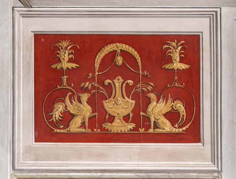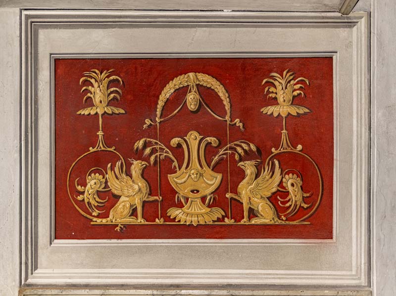 Sopra ognuna delle quattro porte presenti nel salone è affrescata una quadratura rettangolare, delimitata da una finta cornice in pietra e caratterizzata da una campitura rosso scuro di sfondo su cui troviamo un motivo decorativo dal gusto grottesche: vi sono due grifoni raffrontati, palmette, girali vegetali, vasi e una ghirlanda da cui scende un piccolo medaglione.