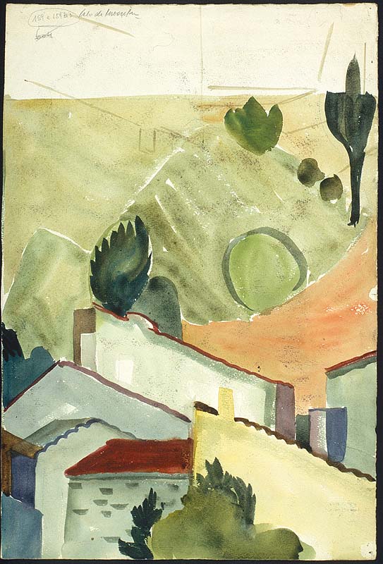Foglio dipinto da entrambe le parti. Su quella principale, datata e firmata compaiono due figure sedute a terra intente a disegnare o leggere, vestite con una blusa bianca e dei pantaloncini; sul retro un paesaggio, che non riempie la totalità del foglio, con colline, case e alberi.