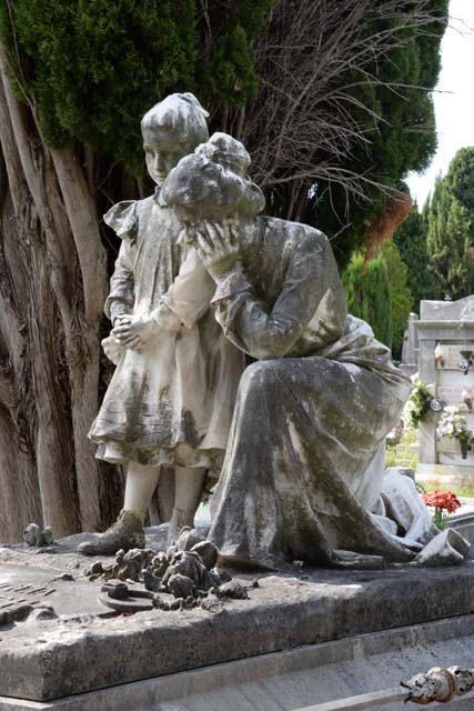 Sopra un sepolcro disseminato di fiori è collocato un gruppo scultoreo formato da una madre inginocchiata e pensosa che cinge con braccio destro il fianco della sua bambina ritratta in piedi con le mani intrecciate in grembo.