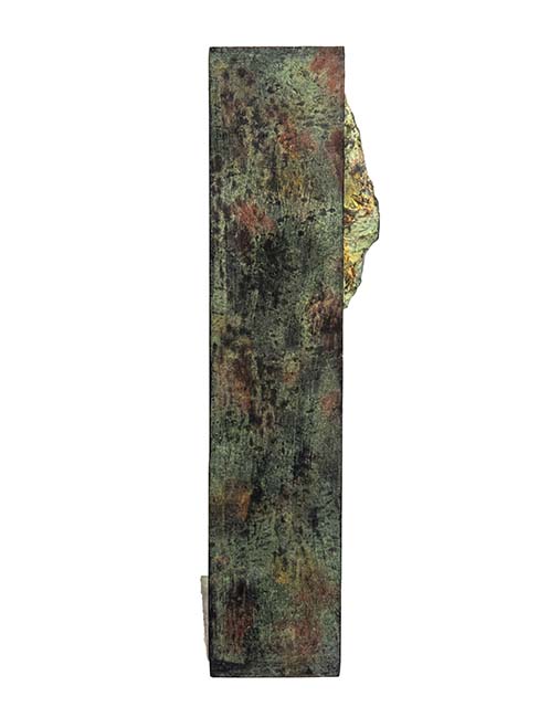 Testa femminile fissata su un'asta di sostegno e incorniciata da una struttura a forma di L. La scultura si presenta cava nella parte posteriore.