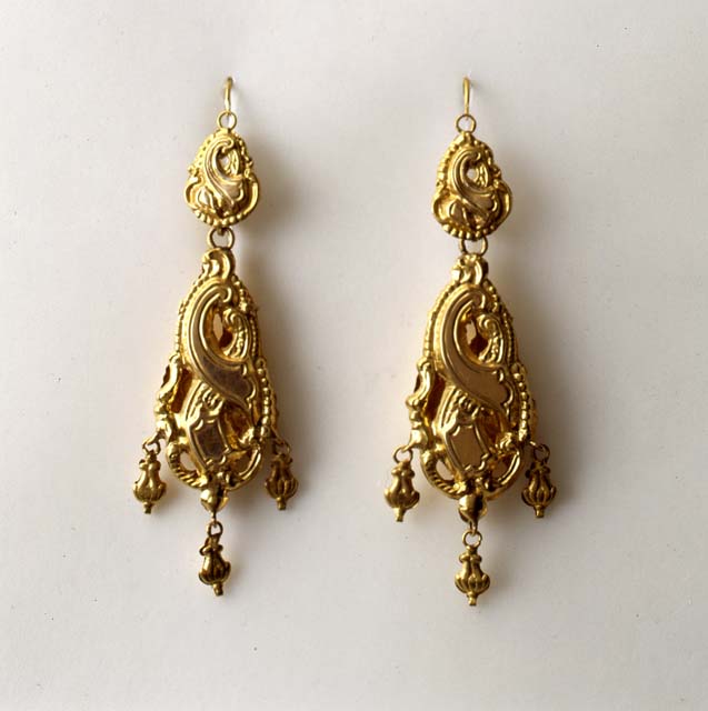 Pur rientrando genericamente in una tipologia che R. M. Cossar (L'arte orafa nella Venezia Giulia, 1940) definisce "orecchini a rana con nappine", come caratteristici dell'area giuliana, questi orecchini presentano piuttosto precise consonanze - in particolare la forma a "S" o a "8" - con esemplari e soprattutto con disegni dell'area tedesca meridionale, degli anni poco precedenti la metà del XIX secolo (M. Malni Pascoletti, 1989, 110a-110d). Ex voto della chiesa di Sant’Ignazio in Gorizia. Acquisto 1985.