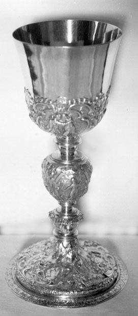Il calice presenta piede circolare, lavorato a sbalzo con raffigurazioni dell'Ultima Cena e di scene veterotestamentarie alludenti all'Eucarestia: caduta della manna, Elia nutrito dai corvi. Il nodo a oliva è arricchito dalle immagini di Santa Margherita, San Giovanni Battista e San Girolamo. Sulla sottocoppa sono riprodotti i santi Antonio abate e Paolo eremita, la scena del loro incontro e la Visitazione. La coppa dorataè liscia e svasata.