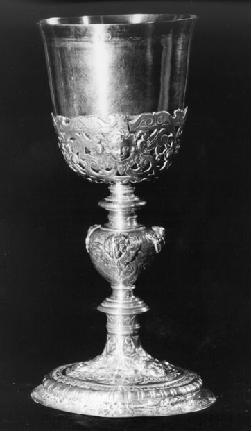 Il piede circolare reca tre testine alate che si ripetono anche attorno al nodo e al reggicoppa traforato.