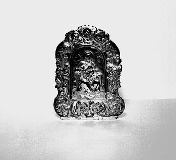 Strumento per il rito della pace. Il manufatto presenta cornice decorata a sbalzo con volute di foglie correnti, culminante con tre testine alate e nubi. Nella tabella centinata centrale è raffigurata la Madonna assisa sulle nubi, che sorregge il Bambino sulle ginocchia e con la mano destra gli porge la corona del Rosario. Sul verso è applicata una maniglia a forma di voluta.