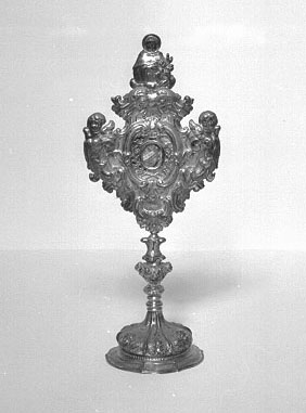 Il reliquiario presenta piede con bordo polilobato e corpo bombato ripartito da sei nervature in spicchi, decorati alternativamente con una testina alata o con piccoli festoni. Il fusto presenta nodo sagomato con testine angeliche aggettanti inframmezzate da festoni di frutta, al di sopra del quale un rocchetto di forme vegetali precede il ricettacolo mistilineo. Quest'ultimo è ornato da volute e foglie, da due testine angeliche laterali e da un frontone mistilineo sormontato da Sant’Antonio da Padova a mezza figura, che porta una mano al petto e con l’altra trattiene il giglio e un libro. La teca ovale è circondata da tralci di giglio a giorno e racchiusa da una cornicetta formata da volute affrontate.