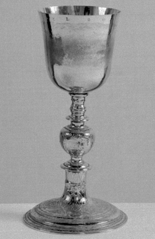 Il calice presenta piede circolare con bordo liscio e corpo decorato da sottili nastri intrecciati inframmezzati da elementi vegetali; fusto con nodo a oliva schiacciato, seguito un alto rocchetto liscio (non originali), coppa liscia svasata.