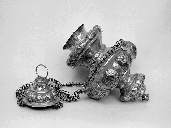 Lampada a forma di grosso vaso panciuto, a piani sovrapposti. Motivi sbalzati e cesellati ornano la superficie. Tre teste cherubiche collegano con altrettante catenelle di sostegno il cupolino terminale.