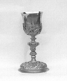 Piede circolare bombato con angioletti che recano, tra foglie d'acanto, strumenti della Passione, motivo ripreso anche nel sottocoppa. Il nodo a sezione triangolare presenta un motivo di foglie disposte a corolla e superiormente teste alate di cherubini.