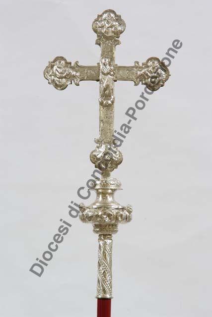 La croce presenta un innesto sul quale si avvolge un nastro multiplo e un nodo sagomato e baccellato, decorato con motivi vegetali e testine alate aggettanti. I bracci, profilati da una cornice modanata liscia e decorati anch'essi da sinuose foglie sbalzate, hanno terminazioni polilobate, che accolgono, sul recto, le immagini di Santa Maria Maddalen, in basso, di San Giovanni Evangelista, in alto, e di due sante che si dispongono ai lati alla figura centrale di Cristo crocifisso realizzata a fusione; sul verso, Dio Padre benedicente, in alto, San Marco e San Luca, rispettivamente a sinistra e a destra, e San Matteo, in basso, mentre al centro è applicata una placchetta con la Vergine orante stante su una nuvola.
