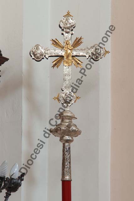 Il manufatto presenta innesto decorato da grandi foglie d'acanto avvolte a spirale, seguito da ampio nodo con testine angeliche aggettanti alternate a volute e foglie. La croce, con bracci profilati da una cornicetta modanata e percorsi da racemi ad andamento contrapposto, presenta terminazioni mistilinee ospitanti personaggi sacri a mezza figura. Sul recto al Cristo crocifisso dorato si accompagnano santa Maria Maddalena, in basso, la Madonna dolente, a sinistra; san Giovanni evangelista, a destra, e una santa non identificata, in alto. Sul verso la Madonna orante centrale è circondata da Dio Padre, in alto, e dagli evangelisti Luca, in basso, Marco, a sinistra, e Matteo, a destra.