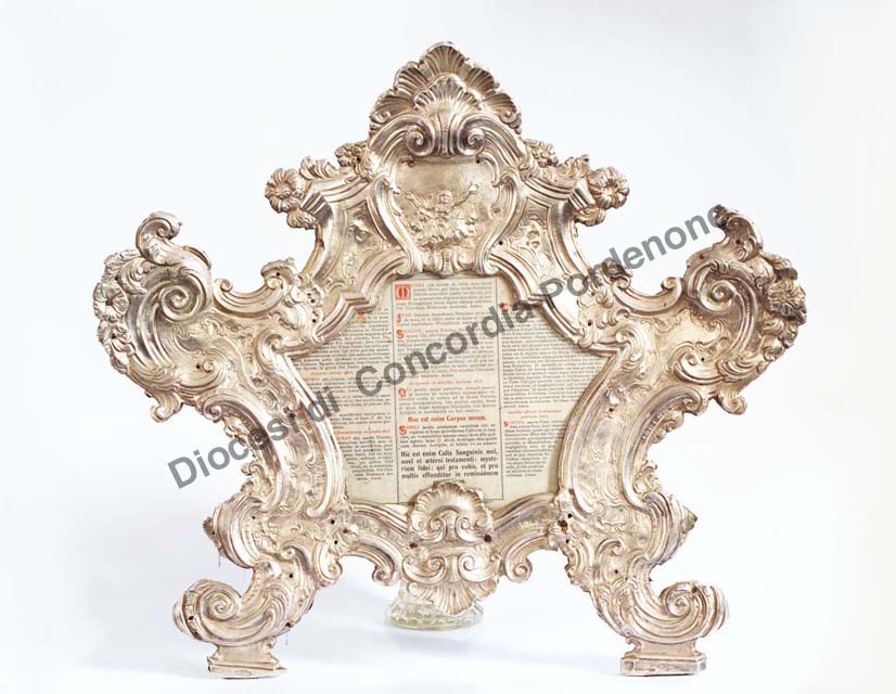 La cartagloria sagomata poggia su piedini a voluta sostenuti da zoccoli squadrati e presenta una cornice decorata da volute modanate arricchite da festoni floreali e conchiglie; il fastigio ospita la raffigurazione delle anime avvolte dalle fiamme del Purgatorio, una delle quali tiene levate le braccia aperte, mentre delle altre si scorge solo il capo.