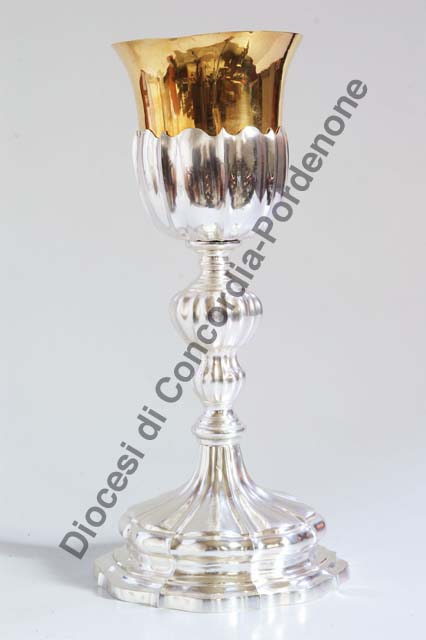 Il calice, interamente percorso da nervature secondo lo stile "San Marco", presenta piede modanato a base mistilinea, fusto con nodo a pera rovesciata, sottocoppa con bordo a profilo mistilineo, coppa liscia dorata leggermente svasata.