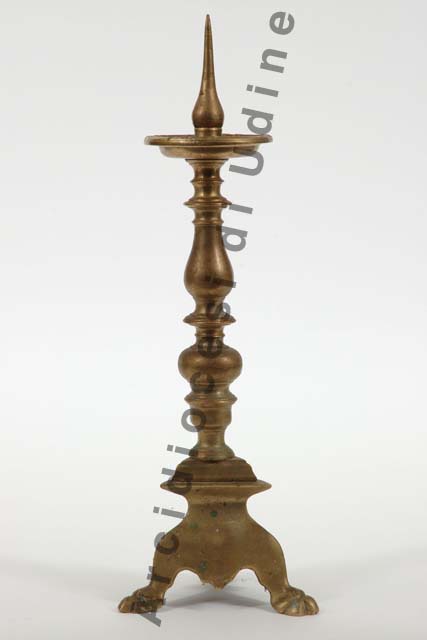 Il candeliera presenta base bombata a sezione triangolare, poggiante su piedini zoomorfi; fusto formato da nodo globulare schiacciato, elemento a balaustro e rocchetti lisci; basso piattello circolare provvisto di puntale arrotondato alla base.