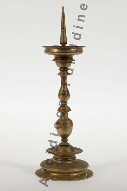 Il candeliere presenta piede circolare sagomato, fusto composto da un nodo a vaso seguito da balaustro, sorreggente piattello sagomato provvisto di robusto puntale centrale.