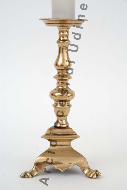 Il candeliere presenta base sagomata a sezione triangolare, poggiante su piedini zoomorfi; fusto costituito da nodo sagomato, elemento a balaustro e rocchetti lisci; basso piattello circolare provvisto di puntale.