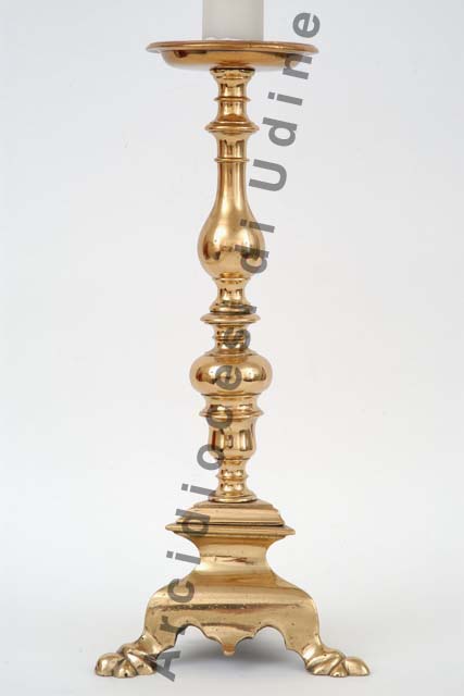 Il candeliere presenta base sagomata a sezione triangolare, poggiante su piedini zoomorfi; fusto costituito da nodo sagomato, elemeto a balaustro e rocchetti lisci; basso piattello circolare provvisto di puntale.