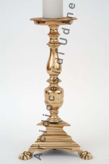 Il candeliere presenta base gradinata a sezione triangolare, poggiante su piedini zoomorfi; nodo a vaso, seguito da elemento a balaustro e da due rocchetti; basso piattello circolare provvisto di puntale.