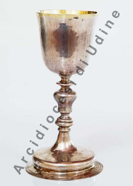 Il calice presenta piede circolare bombato con ampio bordo a linee incise che si ripetono sul corpo. Fusto con nodo a vaso sorreggente coppa svasata liscia, dorata all'nterno e lungo il bordo esterno.