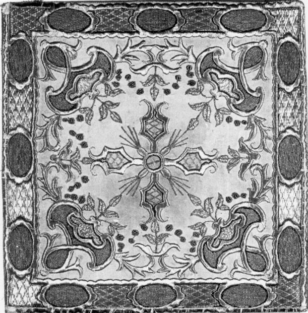 La busta, internamente rinforzata con tela di lino bianco e cartone, è formata da un solo pezzo del tessuto ricamato lungo i bordi dal gallone centrale della pianeta, agli angoli fantasiosi elementi a trionfo con foglioline e boccioli come sulle metà dei lati, convergono verso il centro con la croce a graticole esagonali e raggiata; fodera di rasatello di cotone.