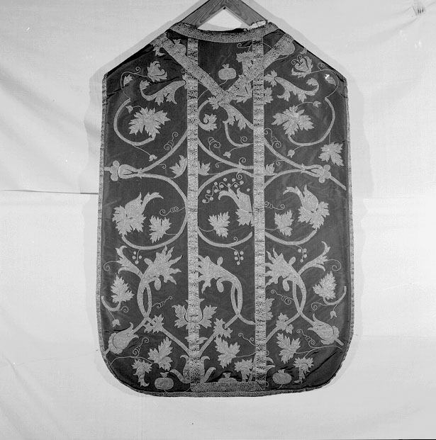 La pianeta a fondo fucsia, la cui stoffa sostituisce l'originale supporto del ricamo, è di epoca recente ed è guarnita allo scollo (sul quale è applicata una trina meccanica) e allo stolone da una gallone tessuto coevo con ordito in oro filato, trama di lino e motivo a losanga ottenuto da legature di ordito. Borda il manufatto un galloncino dello stesso tipo. La fodera, di taffetas colore giallo senape, cucita a mano è contemporanea al tessuto. Il decoro è dato dal ricamo e da applicazioni su gros de Tours giallo laminato ritagliate e riportate. La composizione è disposta a decorare tutto il campo. Steli di vite con pampini, minute foglie e grappoli d'uva, disegnano volute distribuite in tre sequenze parallele.