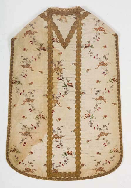 Pianeta confezionata con otto frammenti di tessuto giunti in parte sotto il gallone, dove si evidenzia la mancanza di allineamento delle righe orizzontali. In corrispondenza delle croci anteriori sono applicati, con una cucitura a macchina, due frammenti di tessuto diverso. Gallone formato da ventaglietti in oro filato su anima di seta gialla e lamellare; presente un altro gallone realizzato con i medesimi materiali, ma con decoro geometrico. Controfodera di lino rosa posta su tutta la superficie davanti e dietro, mentre nelle colonne degli stoloni è inserita una controfodera di canapa. Fodera in diagonale di cotone avorio, cucita a mano. Pizzo a fuselli sul collo.