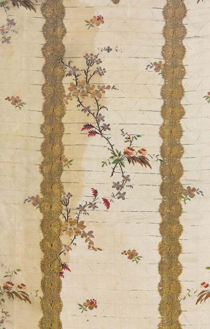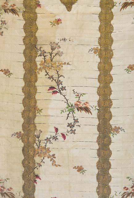 Il motivo decorativo costruito sul ripetersi di un solo motivo disegnativo, sebbene molto semplificato, può essere collegato alla tipologia “a meandro”, assai diffusa in svariate forme dalla metà del secolo XVIII. La riduzione del tralcio e la stlizzazione dei mazzetti fioriti, ancora ad impianto ondulante verticale, la rigidità del fondo a sequenze orizzontali, fanno avanzare una datazione intorno alla fine del secolo XVIII.