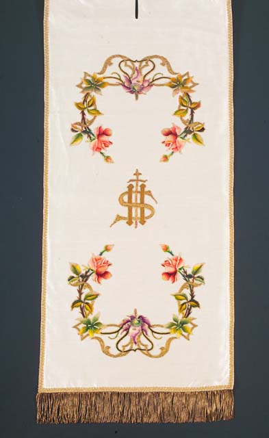 Gli elementi a ricamo presenti nel manufatto decoravano un piviale appartenente ad un insieme liturgico degli inizi del Novecento. Sebbene le caratteristiche originali del ricamo appaiono in parte alterate si evidenzia ancora una certa accuratezza nella scelta cromatica e nell’impostazione spaziale. L’insistenza della tematica vegetale e naturalistica è certamente da intendere, oltre che per l’effetto decorativo, anche per il valore simbolico. Lo stemma della famiglia Fantoni, ricamato sulla fodera del velo omerale e sul piviale, quest’ultimo rimosso, testimonia la provenienza dei paramenti, commissionati dalla famiglia presumibilmente a ricamatori di ambito locale. Come riportato da testimonianze orali e in mancanza di dati d’archivio, non è escluso che il manufatto rientri nelle donazioni del sacerdote Giuseppe Fantoni (1869-1938) in occasione de venticinquesimo anniversario della sua consacrazione, celebrato nel 1917.