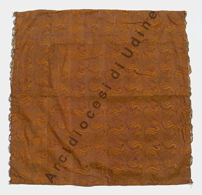 Fondo avorio con soluzione decorativa data da motivi sinuosi azzurri che sostengono mazzi di rose volti a destra e a sinistra. E’ bordato con una trina in oro filato e lamellare con motivo di valva. La fodera in raso lanciato è tessuta con filato ocra per l’ordito e filato viola per le trame lanciate; sul fondo ocra si stagliano linee verticali ondulanti con fiori a spiga intervallati ad altri elementi tipi cachemire. Gallone a barrette verticali in oro filato e lamellare.