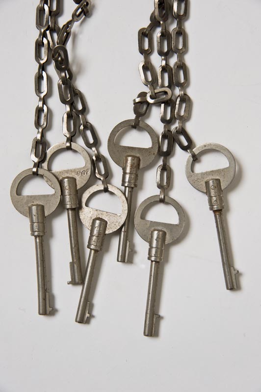 Insieme di 8 chiavi, di cui 6 dotate di catenella con anelli a sezione ovale, e tutte quante appese ad un elemento circolare realizzato in filo di alluminio. Le chiavi presentano un semplice chiavistello circolare con piccola tacca rettangolare variamente posizionata e un'impugnatura a disco semicavo (per le 6 chiavi con catenella, sul disco sono incisi il n. 902 e rispettivamente i nn. 1, 2, 3, 4, 5, 6).