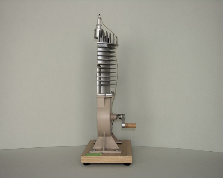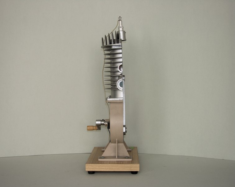 Oggetto metallico con basamento in legno, dotato di quattro piedini d'appoggio angolari in gomma. Lo strumento è un modellino di una sezione di un motore a scoppio a due tempi; ben visibili sono il pistone, il volano, la camera di scoppio i tubi di aspirazione e scarico dei gas e la candela d'accensione. In particolare il pistone è collegato a un sistema a manovella, in modo da mostrare il funzionamento del meccanismo del motore; inoltre la candela è collegata ad una batteria capace di generare la scintilla d'accensione.