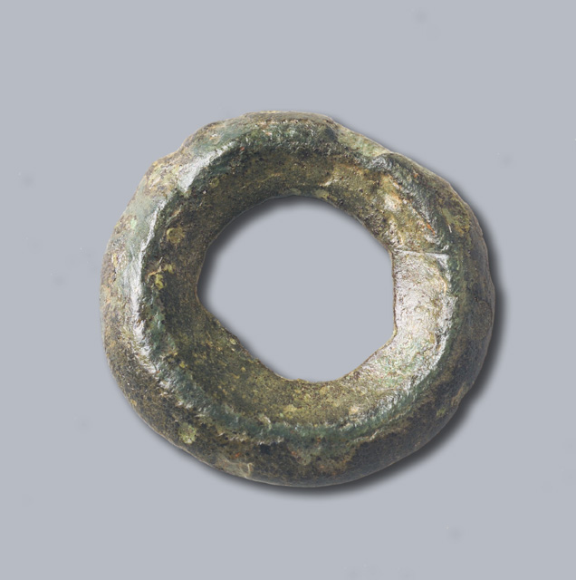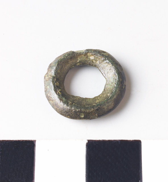 Anellino con verga a sezione subromboidale, convessa all'esterno, concava all'interno, di spessore asimmetrico, forse pertinente ad una parure a catenella. Con patina verde molto scuro