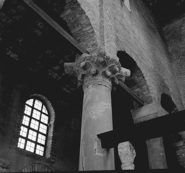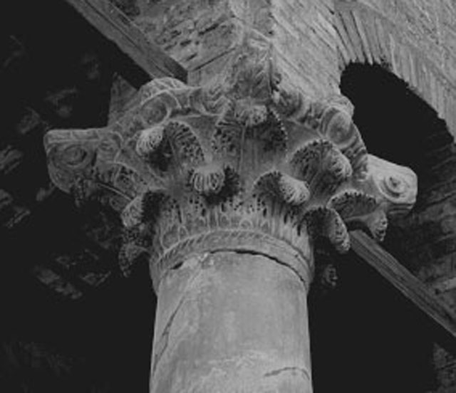 Capitello composito con due corone di foglie d'acanto lavorate a trapano dalle punte ripiegate verso il basso, corona di ovoli e quattro coppie di volute