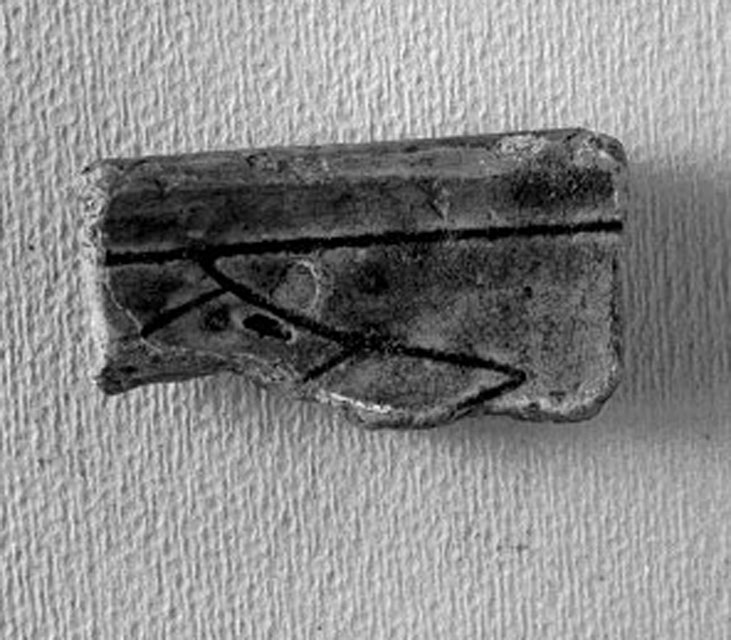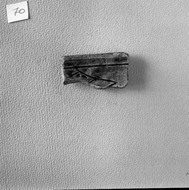 Frammento di scodella con orlo arrotondato, parete decorata da motivo geometrico inciso a punta: parte di losanga tagliata in croce. Invetriatura color verdastro sia internamente che esternamente.