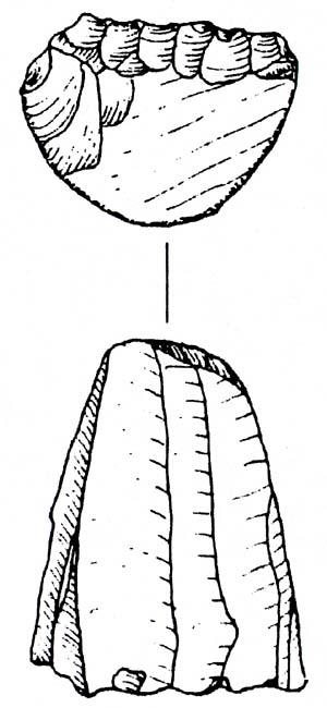 Nucleo piramidale a lamelle, ad un piano di percussione preparato, da ciottolo di selce grigia parzialmente corticato.