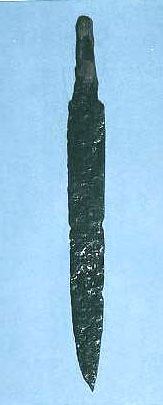 Lama a un solo taglio con dorso leggermente incurvato in punta. Spalle oblique e codolo piatto rastremato a sezione rettangolare con residui del legno dell'impugnatura. Nella lama, in prossimità del dorso, su una sola faccia, presenta una scanalatura longitudinale che si arresta poco prima della punta. Rinvenuta vicino al femore destro dell’inumato.