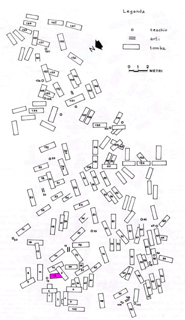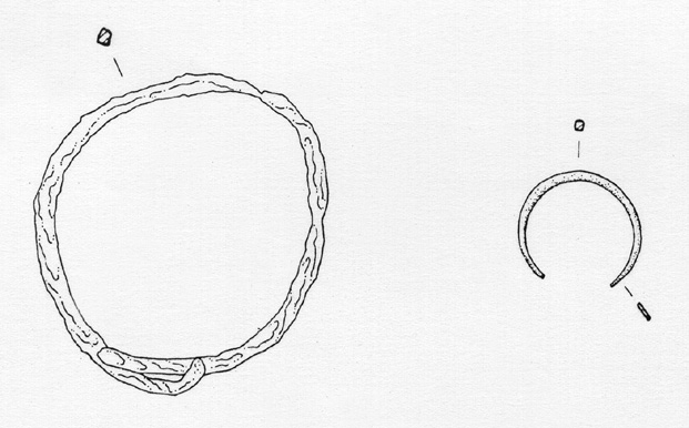 Corredo della tomba 12, composto da: una fibbietta in bronzo da cintura "tipo Siracusa" (mancante dal luglio 1979), senza ardiglione, decorata all'interno della placca a cuore da 6 occhi di dado; un'armilla in ferro; un anello in bronzo (forse confuso con quello menzionato nell'inventario degli oggetti della vicina tomba 10)