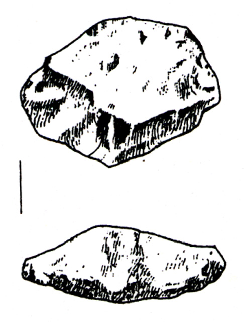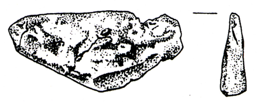 Resti dello scudo, rinvenuto sullo sterno dell'inumato. Dell'umbone rimane un frammento di lamina ricurvo: Dell'imbracciatura, in 6 frammenti, si conserva parte dell'impugnatura mediana con tracce delle alette che fermavano la parte lignea; l'impugnatura è delimitata da due piastre circolari, ora spezzate, munite di ribattini ferrei di forma circolare piatta con parte dello stelo di fissaggio; altri frammenti corrispondono alle aste laterali leggermente rastremate e a sezione rettangolare. RIBATTINI, otto, di forma circolare piatta con bordo piatto obliquo pendente; sul retro stelo di fissaggio a sezione circolare; due ribattini sono di un diametro leggermente minore rispetto agli altri sei.