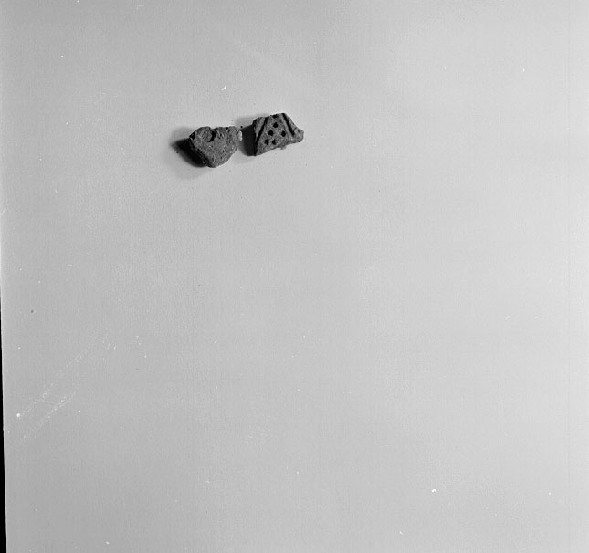Due frammenti di parete non pertinenti allo stesso recipiente. 101268: frammento decorato con solcature a crudo e coppelle impresse, impasto compatto bruno chiaro; 101269: frammento decorato con impressioni a coppelle, a crudo, superficie lisciata e impasto compatto bruno scuro.