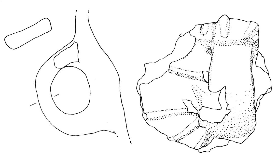 Fr. di coperchio, ansa ad anello, leggermente insellata, luce ampia; dall'ansa si dipartono dei cordoni lisci disposti a raggera; impasto grossolano, superfici lisicate, dall'arancio al nero