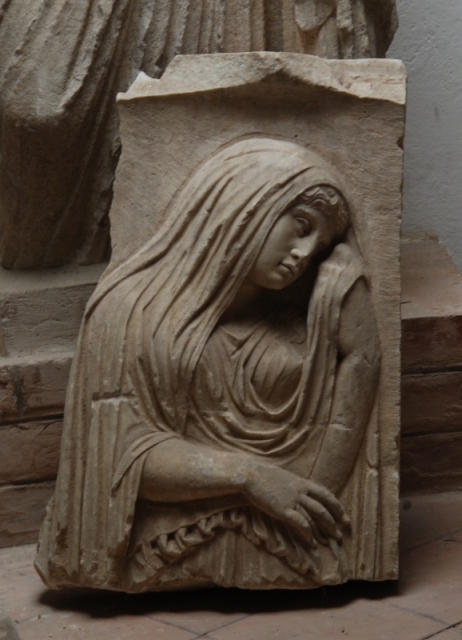 Rilievo sepolcrale anepigrafe, privo di corniciature laterali, bordato superiormente da una fascia aggettante. Sulla faccia superiore ci sono due incassature per grappe metalliche, funzionali all’ancoraggio ad altre lastre o blocchi contigui lateralmente. Le superfici della fronte sono accuratamente levigate; il retro, la faccia superiore e il fianco destro sono semilavorati.