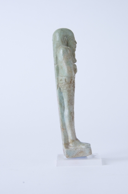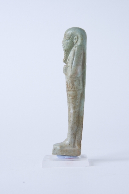 Statuina funeraria mummiforme, che indossa una parrucca tripartita e la barba divina intrecciata. Le mani sono incrociate, la destra sopra la sinistra, e portano rispettivamente una zappa e un piccone. Dalla spalla sinistra pende una sacca. Il pilastro dorsale e la base sono presenti. L’iscrizione si trova sulle gambe dell’ushabti ed è a forma di T.