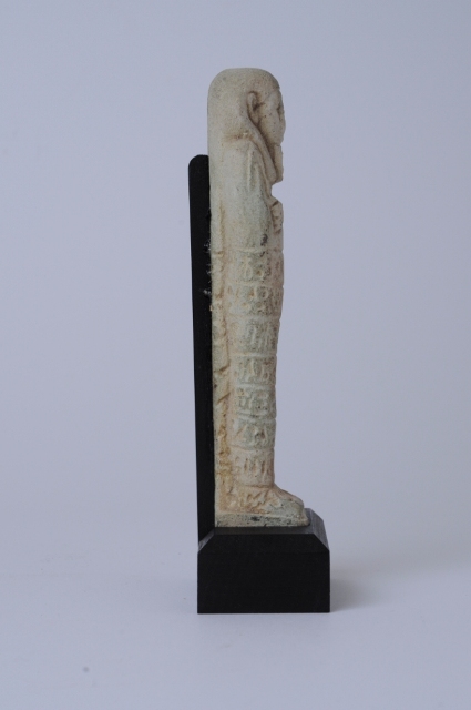 Statuina funeraria mummiforme che indossa la parrucca tripartita e la barba divina. Le braccia sono incrociate sul petto, le mani sono affiancate: nella sinistra c'è una zappa e nella destra un piccone. Dietro la spalla sinistra pende una sacca. Sul dorso c'è il pilastro dorsale che forma un tutt'uno con la piccola base quadrangolare. L'iscrizione è composta da otto righe parallele attorno al corpo, che riportano il consueto capitolo 6 del Libro dei Morti.