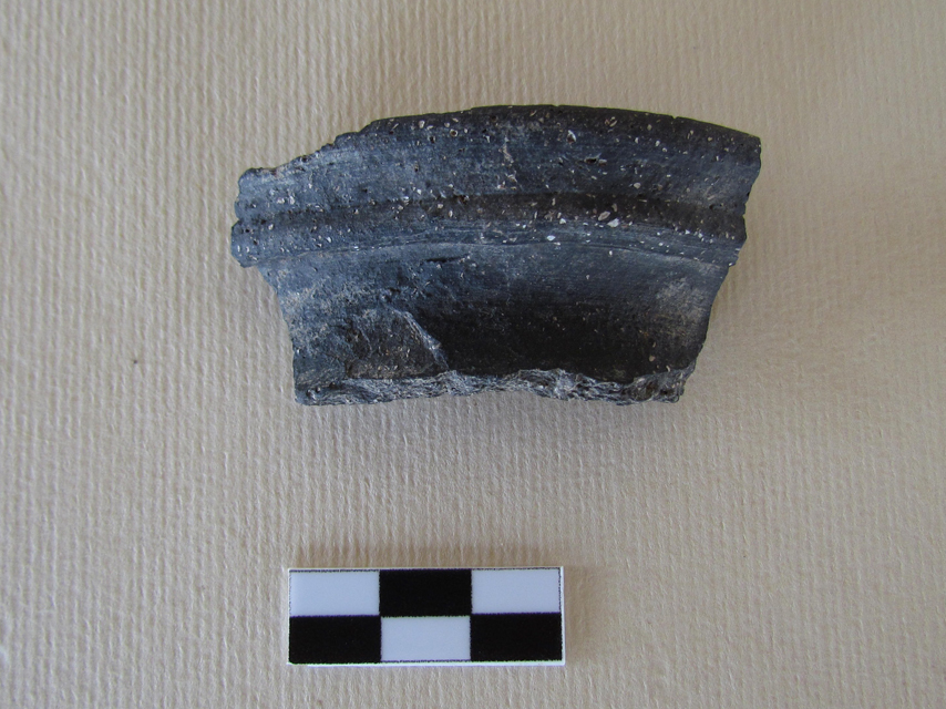 olla con orlo estroflesso, bordo a fascia modanata leggermente pendulo, labbro arrotondato. Il corpo ceramico è caratterizzato da impasto duro, secco al tatto, fratture nette. Argilla grigia, con superfici annerite, in particolare in corrispondenza della parete interna. Inclusi frequenti di calcite, selezionati e ben distribuiti, di dimensioni prevalentemente piccole. Impasto in frattura: colore Munsell 5 Y 2/1 (black).
