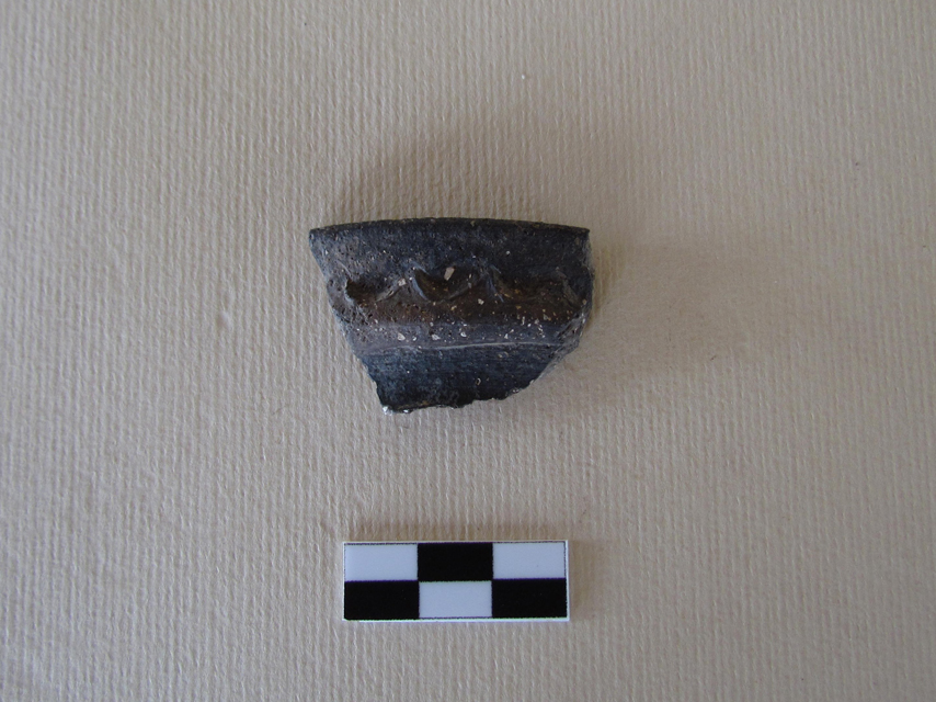 frammento di olla con orlo a fascia modanato; labbro arrotondato, leggermente inclinato verso l'esterno. Il bordo è decorato con un motivo a onda. Il corpo ceramico è caratterizzato da impasto duro, secco al tatto, con fratture piuttosto regolari. Argilla da marrone a grigio-nera. Inclusi frequenti e ben distribuiti di calcite, di piccole dimensioni. Impasto in frattura: colore Munsell 10 YR 2/2 (very dark brown).