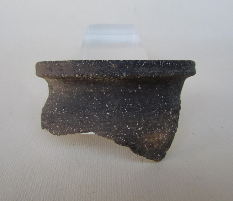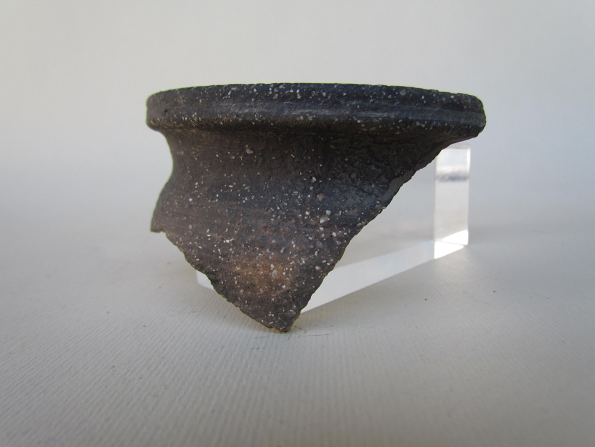 Frammento di olletta con orlo estroflesso impostato su gola marcata, bordo ingrossato e arrotondato, lievemente aggettante, labbro assottigliato e arrotondato, con lieve incavo interno. Sulla parete, a partire dalla spalla, sono visibili striature parallele orizzontali, probabilmente realizzate a stecca con intento decorativo. Impasto tenero, secco e liscio al tatto; fratture irregolari; presenza di vacuoli. Argilla marrone, con superfici annerite in corrispondenza dell'orlo. Inclusi di calcite frequenti e ben distribuiti, di dimensioni piccole e medie.