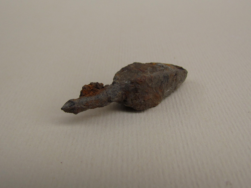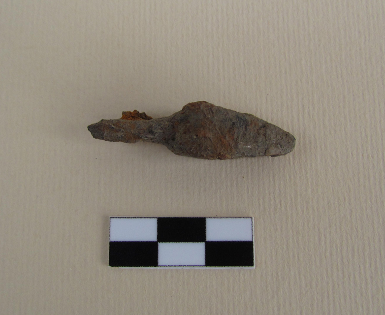 Cuspide di proietto per arma da corda (punta di freccia per arco) con innesto a codolo; punta piramidale a sezione romboidale.