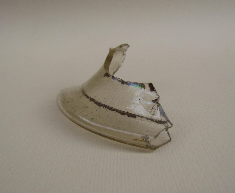Frammento di bottiglia con piede ad anello rialzato. Vetro giallo trasparente; numerose bolle minute e piccole; rare bolle medie.