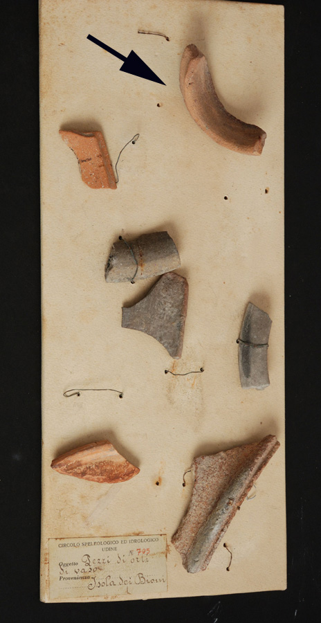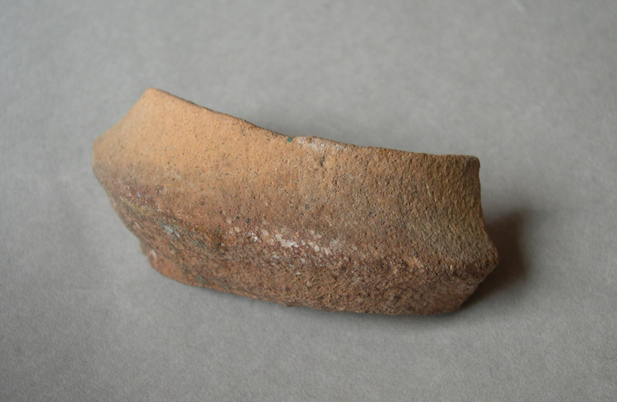 Frammento di orlo a sezione triangolare, con profilo biconico. Impasto di colore arancio duro, ruvido al tatto e caratterizzato da inclusi calcarei e chamotte.